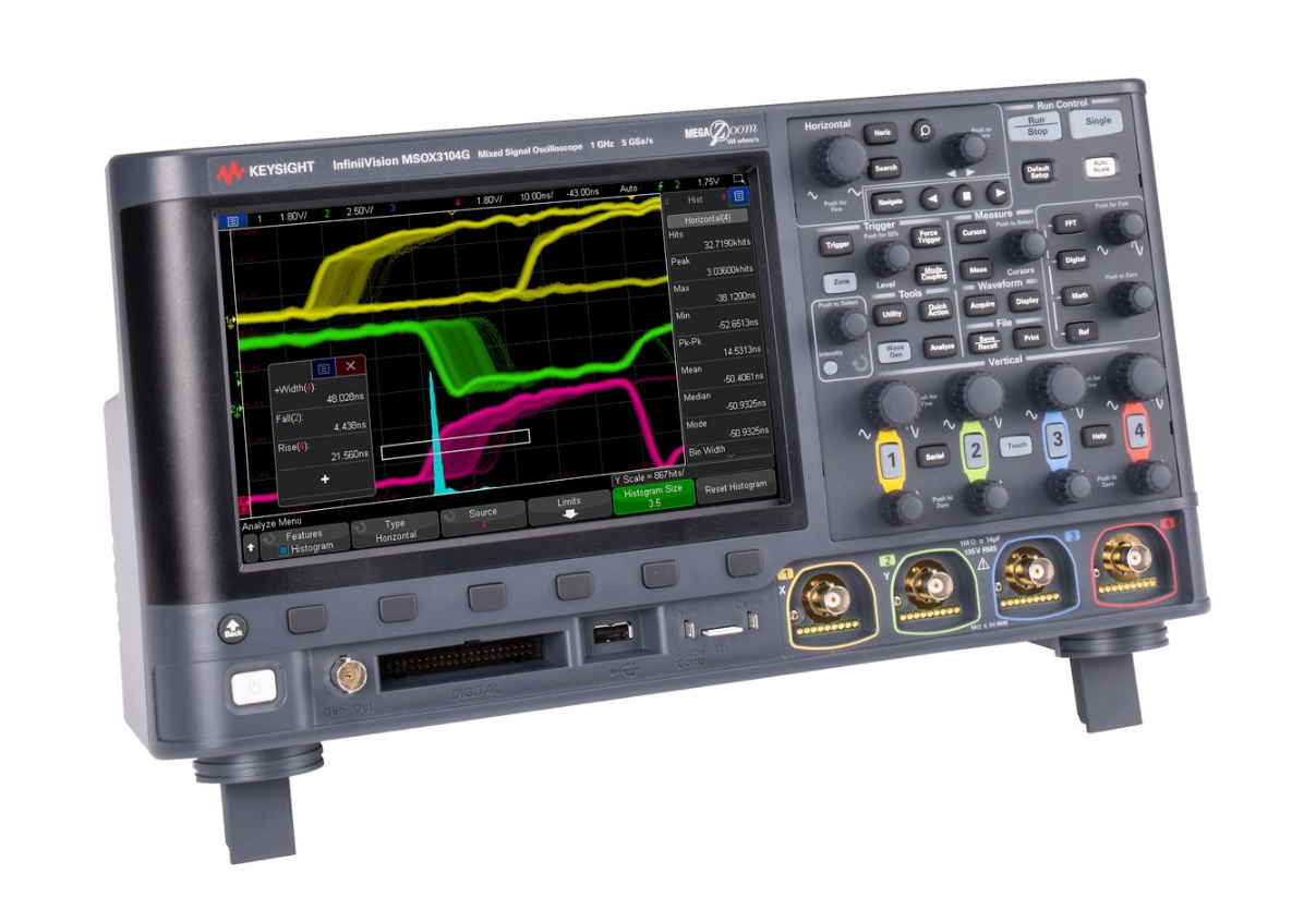 MSOX3012G 100 MHz 示波器提供 2 个模拟通道和 16 个数字通道、4 Mpts 存储器、1,000,000 个波形/秒的更新速率、带 8.5 英寸电容式触摸屏的区域触摸触发器,以及带有波形和测量直方图的标准嵌入式软件。