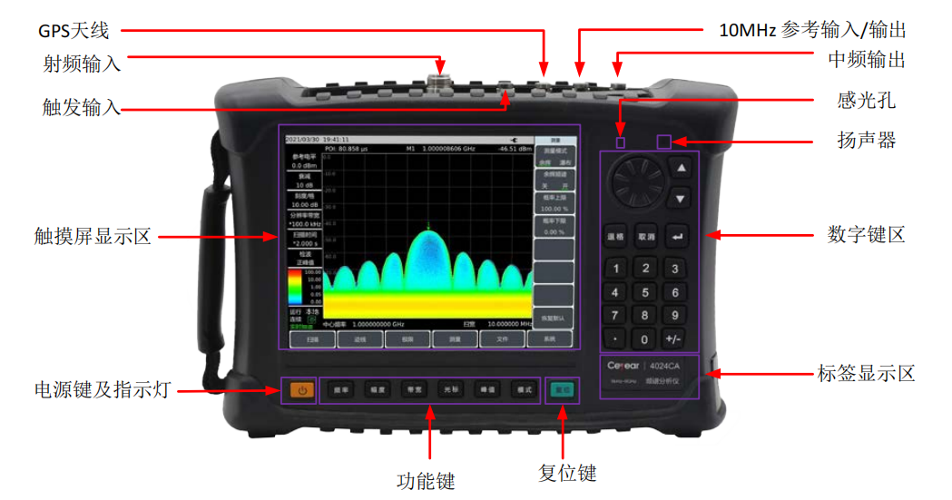 多样的辅助测试接口:10MHz参考输入输出接口、GPS天线接口、零扫宽中频输出接口、外触发输入接口等