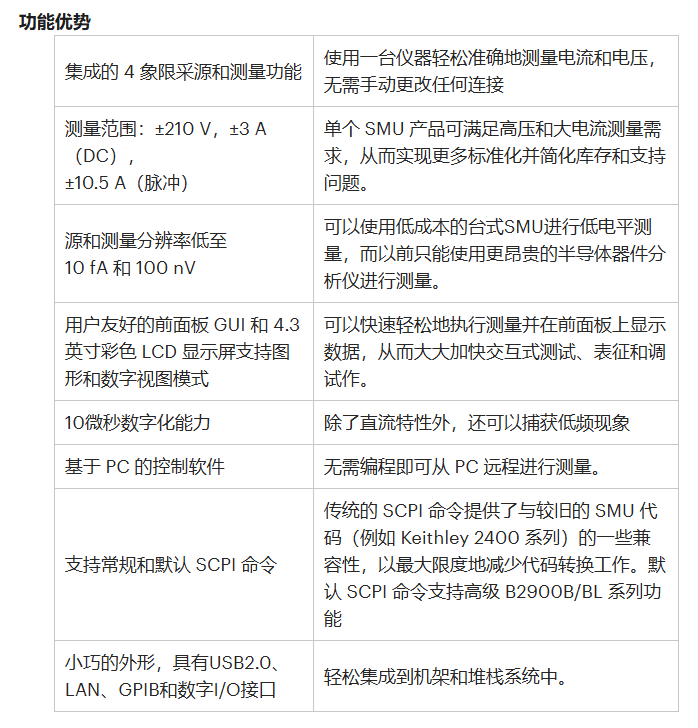 SMU 是流行且广泛的仪器,用于在许多不同的领域和应用中执行静脉测量,因为它具有集成的电压和电流源和测量功能。B2900B/BL 系列 SMU 以非常合理的价格提供卓越的性能和可用性。此外,B2900B/BL 系列 SMU 支持许多功能,以加快生产测试速度并提高吞吐量。B2900B/BL 系列 SMU 的多功能测量功能使其成为各种静脉测量的理想选择,例如半导体测试、有源/无源元件测试以及通用电子器件和材料表征。