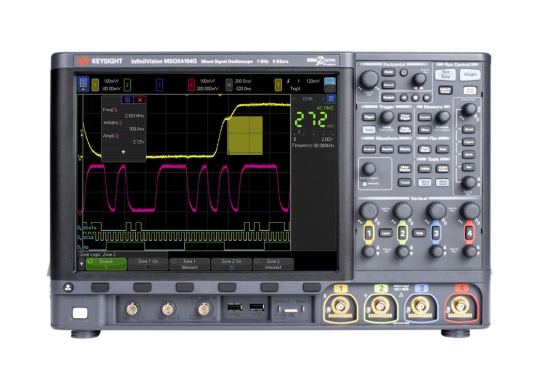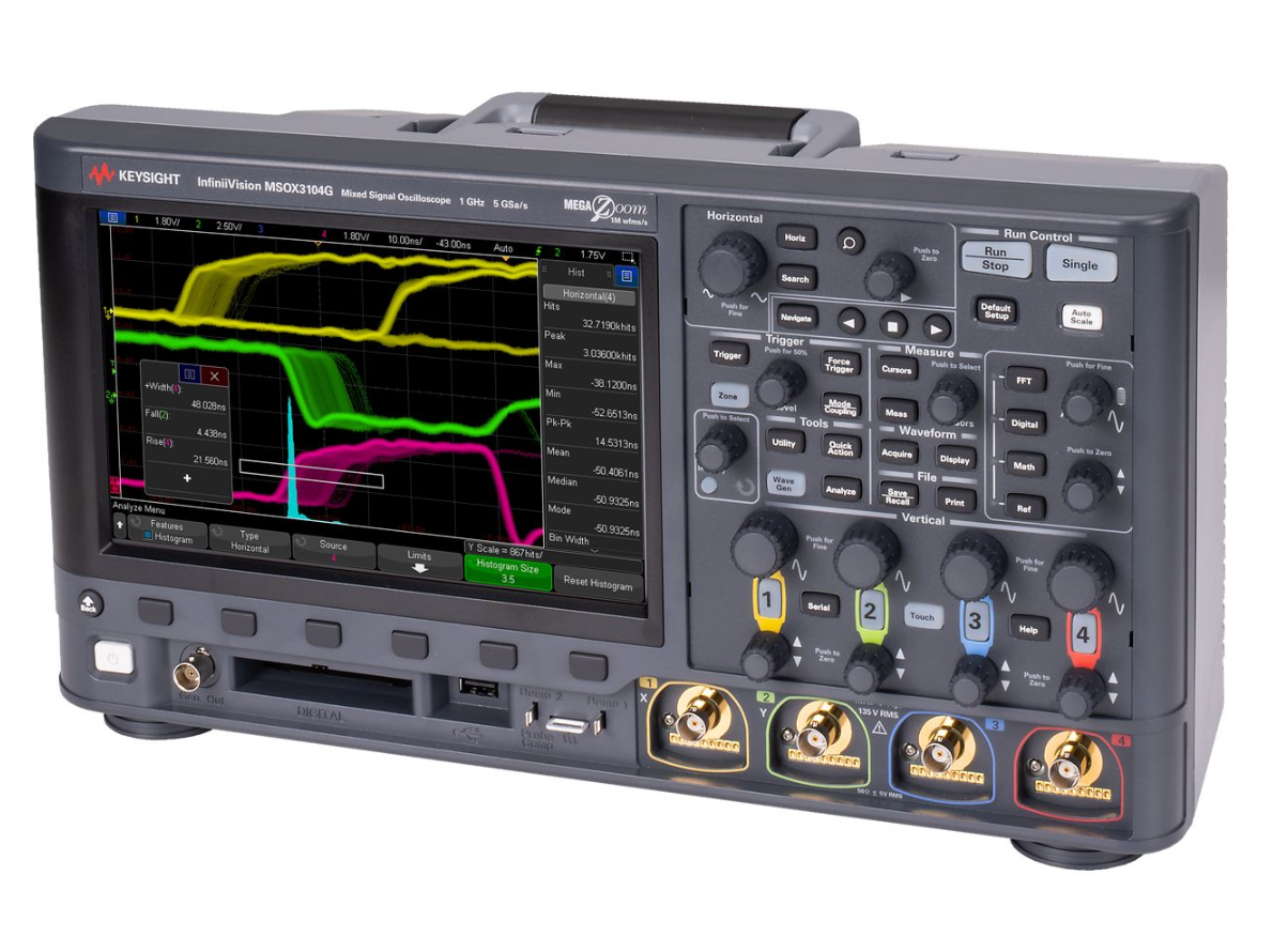 MSOX3012G 100 MHz 示波器提供 2 个模拟通道和 16 个数字通道、4 Mpts 存储器、1,000,000 个波形/秒的更新速率、带 8.5 英寸电容式触摸屏的区域触摸触发器,以及带有波形和测量直方图的标准嵌入式软件。