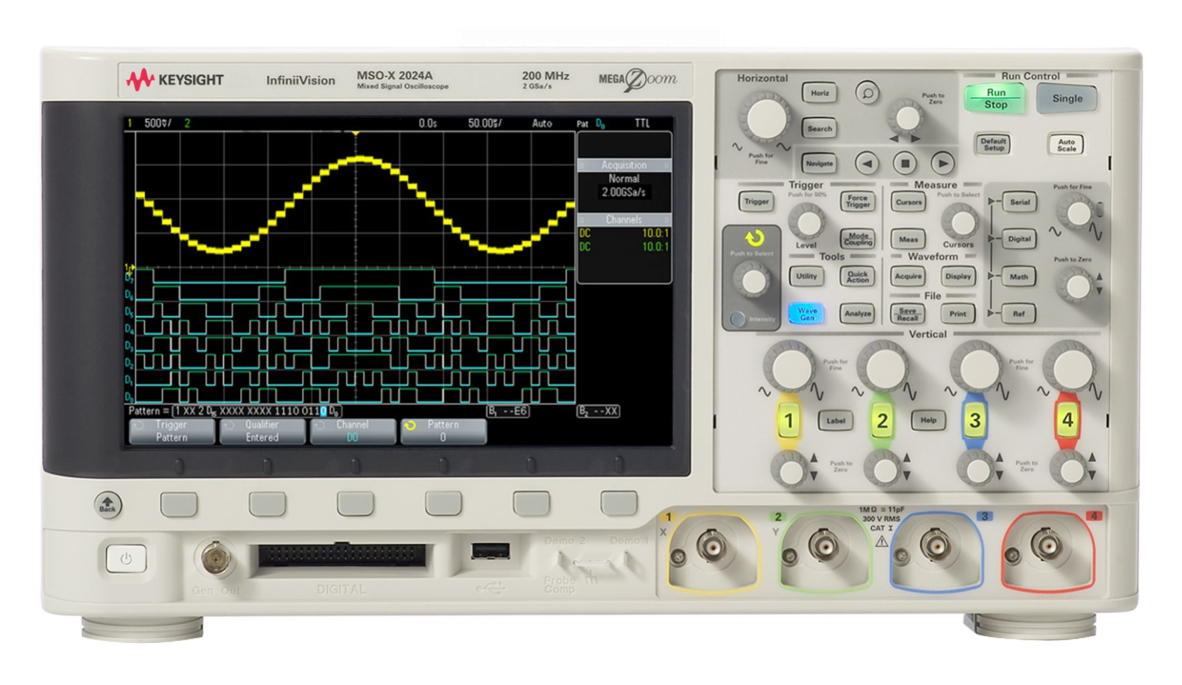 仪器集成:示波器(带 LAN / VGA 连接模块)、协议分析仪、频率响应分析仪(波特图)、20 MHz 任意波形发生器、3 位电压表、8 位计数器和累加器以及用于 16 个数字通道的混合信号示波器